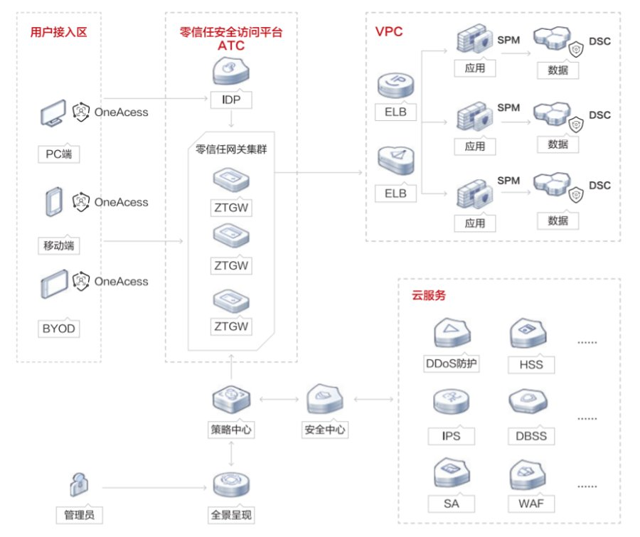它为了很好的解决这三个问题,采用了“一中心三平台”这样的解决方案,一中心指的是安全运营中心,而三平台指的是数据安全管控平台、零信任安全访问平台和终端安全准入平台,依靠这些“一中心三平台”,华为云就企业的网络安全问题有了很好的防护方式和解决方案。