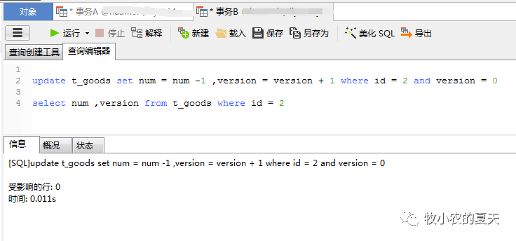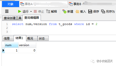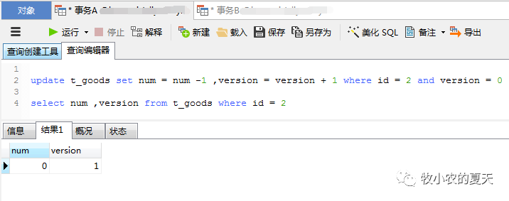 这个时候我们可以看到事务A更新成功,并且库存-1 版本号+1成功