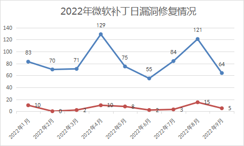 从漏洞数量来看,今年相较去年少量减少。微软在2022年9月份爆发的漏洞相较于去年有少量的减少。本月出现了 64 个漏洞补丁,并且有 5 个 Critical 类型的漏洞补丁。