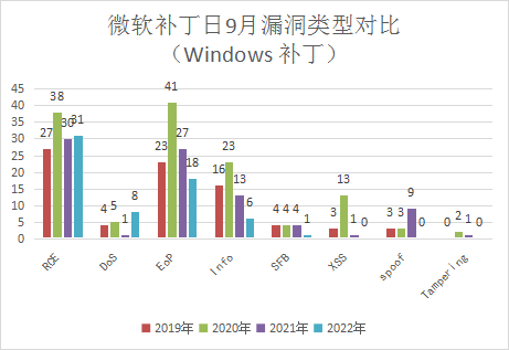 2019-2022年,9月份的漏洞各个类型数量对比如下图: