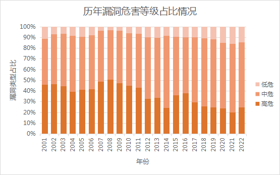 图2 NVD漏洞库2001年-2022上半年漏洞危害等级占比情况
