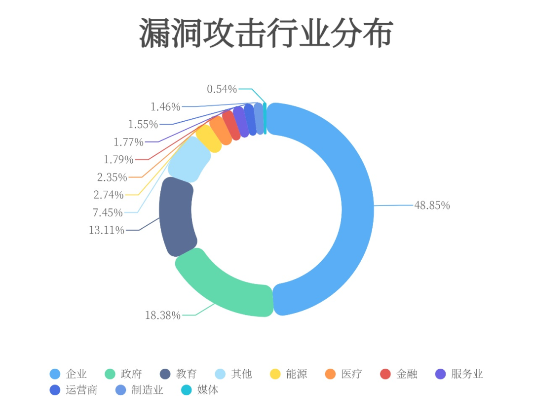 今年上半年,在深信服云端监测到的漏洞攻击中,针对企业的攻击占 48.85%,针对政府的攻击占 18.38%,针对教育的攻击占 13.11%。勒索组织通常会向企业发起攻击,以获取更高的赎金,APT 组织会向政府、教育行业发起攻击,获取机密且有价值的信息,而这两类攻击在初始阶段通常会选择利用漏洞来打开缺口。也因此,企业、政府、教育类行业一直是网络攻击的重灾区,做好这方面的防护已经刻不容缓。