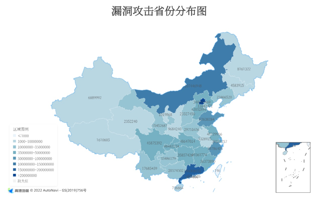 根据深信服云端监测的漏洞规则拦截数据,按照漏洞攻击省份划分,其中被攻击次数最多的省份是北京市,达到了两亿余次,其次是广东省、内蒙古自治区,数量都超过了一亿次,如下图所示。