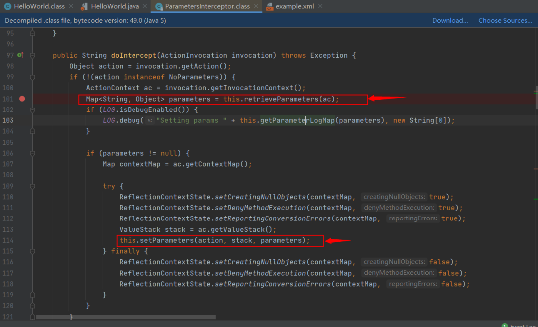 主要代码分析如下,在 101 行获取了 URL 中的参数,在114行调用了 setParameters() 方法: