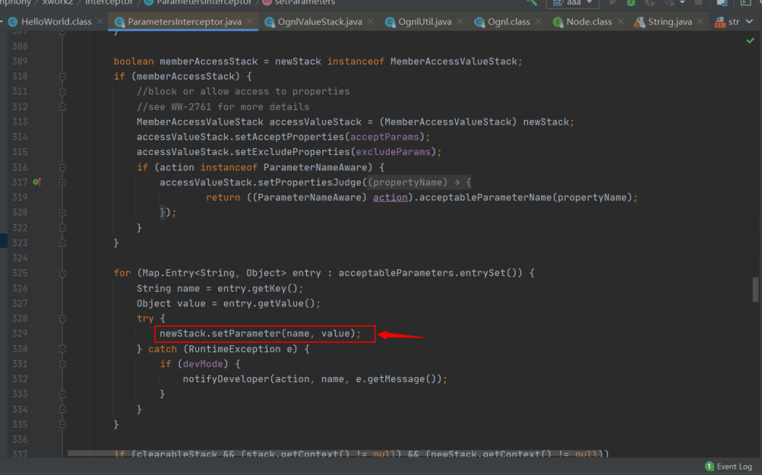 跟入 setParameters() 方法,其中 329 行的newStack.setParameter(name, value) 利用了 OGNL 调用了对应的 Set 方法,而由于每个 action 必然继承容器的classLoader,所以必然可以通过 action 去覆盖 classLoader 的相关属性,修改 tomcat 的日志位置、后缀等造成 RCE 。