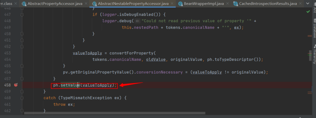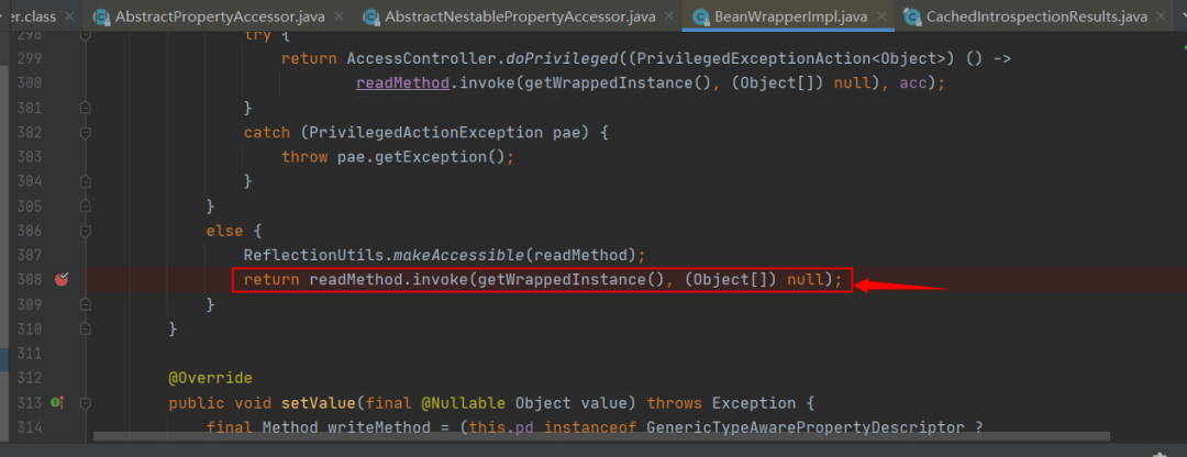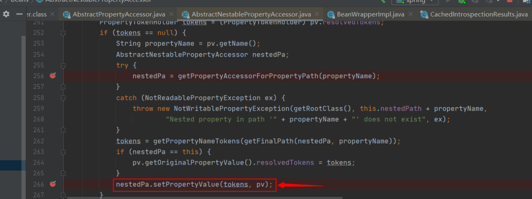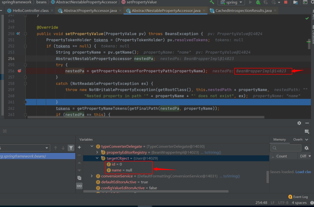 接下来进行代码分析,我先在AbstractNestablePropertyAccessor 类的 256 行打一个断点,然后访问 localhost:8080/springrce1/hello?name=aaaa,可以看到getPropertyAccessorForPropertyPath 方法通过propertyName 可以找到目标存在的属性,并且转换为BeanWapperImpl 类: