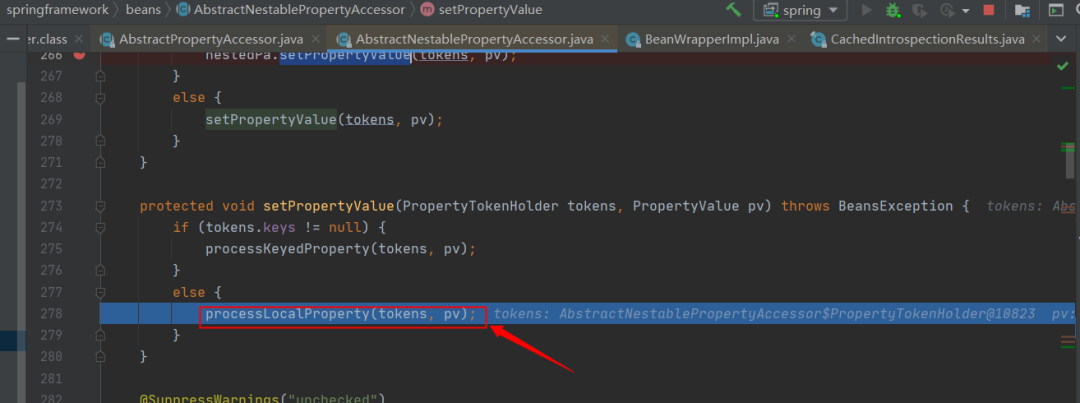 跟入 setPropertyValue 方法,在 278 行调用了processLocalProperty()方法: