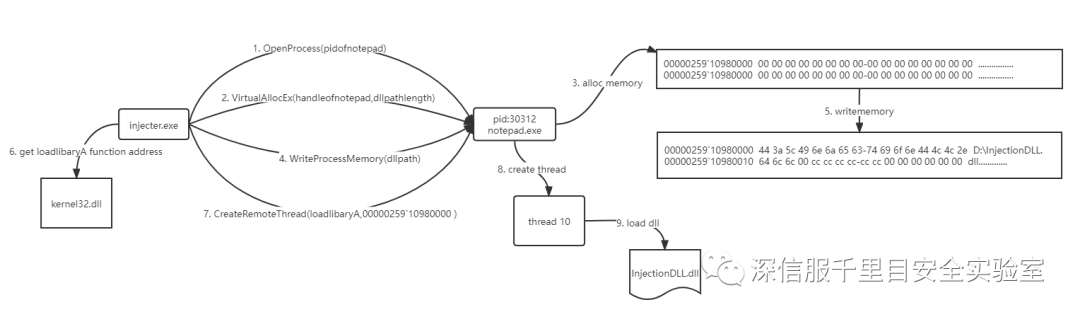 6) 通过 CreateRemoteThread() 函数来调用 LoadLibraryA() 函数,在被注入进程新启动一个线程,使得被注入进程进程加载恶意的 DLL。