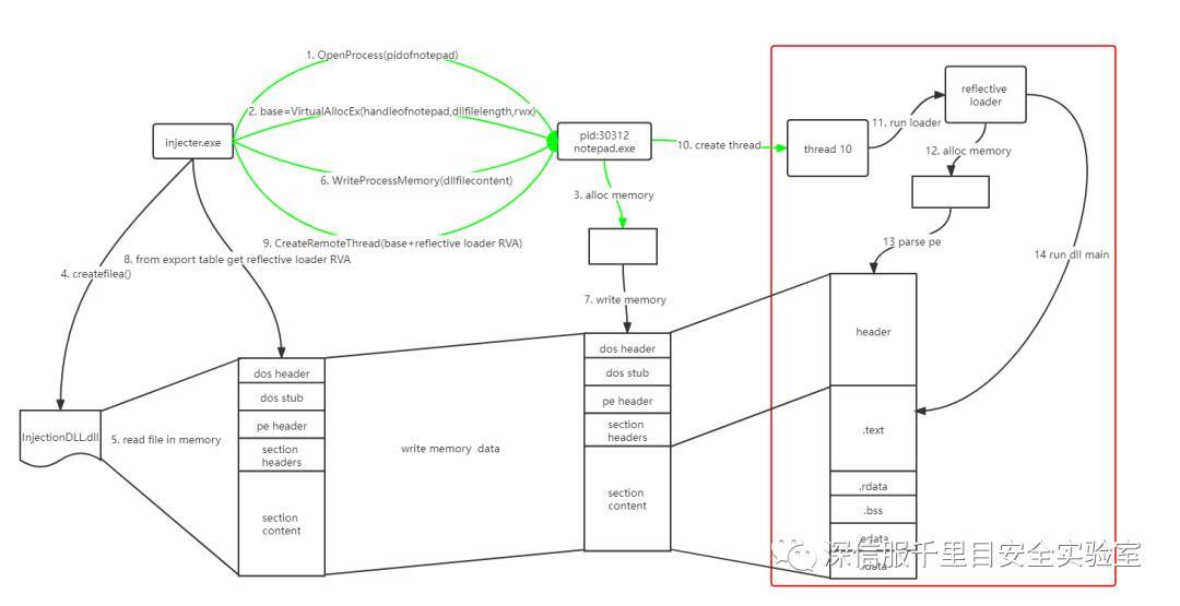 1) 获得被注入进程未解析的 dll 的基地址,即下图第7步所指的 dll。