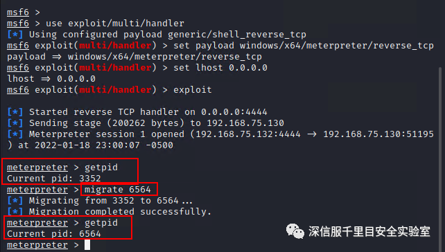 在获得 meterpreter session 后可以直接使用 migrate 命令迁移进程,其效果如下图所示: