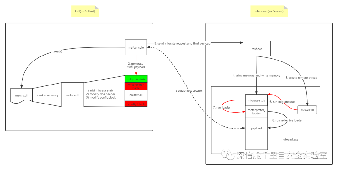 migrate 的模块的实现和 stephen fewer 的 ReflectiveDLLInjection 项目大致相同,增加了一些细节,其实现原理如下: