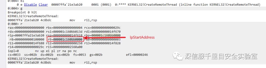 所以我们要找第四个参数 lpStartAddress 的值,即 r9 寄存器的内容,