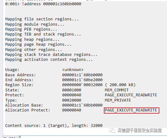 s -a 000001c1`60bb0000 L32000 MZ 000001c1`60bb0000为上面的lpStartAddress,3200为我们获取到的内存块大小