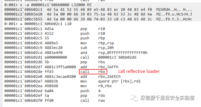 meterpreter loader 将 reflective loader 函数的地址放到 rbx 中,所以我们可直接断在此处,进入 reflective loader 的函数,如下图所示