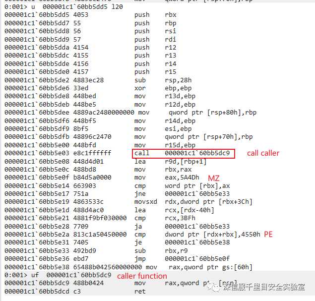 reflective loader 首先 call 000001c1`60bb5dc9 也就是caller()函 数,caller() 函数的实现就比较简单了,一共两条汇编指令,起作用就是返回下一条指令的地址
