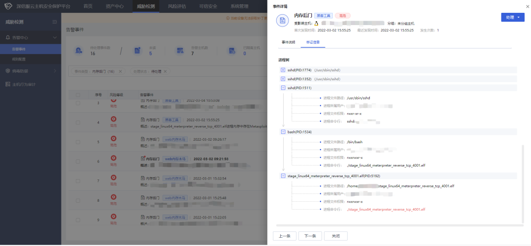 深信服云主机安全保护平台 CWPP 能够有效检测此类利用反射式 dll 注入 payload 的无文件攻击技术。检测结果如图所示: