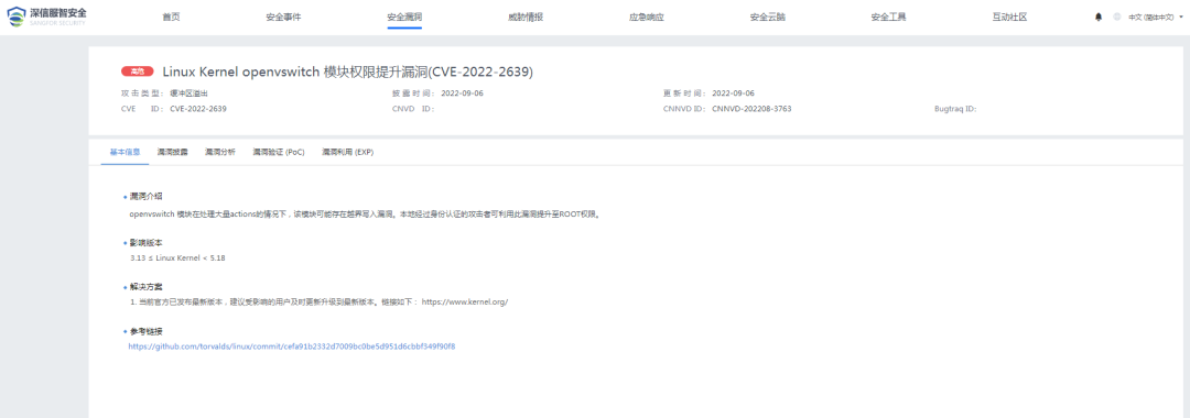 深信服监测到 Linux Kernel openvswitch 模块权限提升漏洞信息。