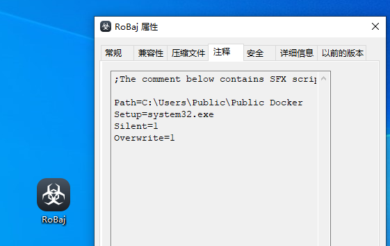 查看文件的属性信息,发现该文件为自解压格式 ZIP 压缩文件,同时在该文件的属性信息中包含了注释内容,该文件会在 C:\Users\Public\Public Docker 目录下释放所有文件,其中 system32.exe 属于启动文件,如下所示: