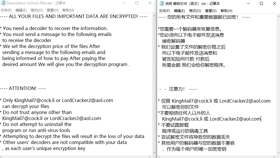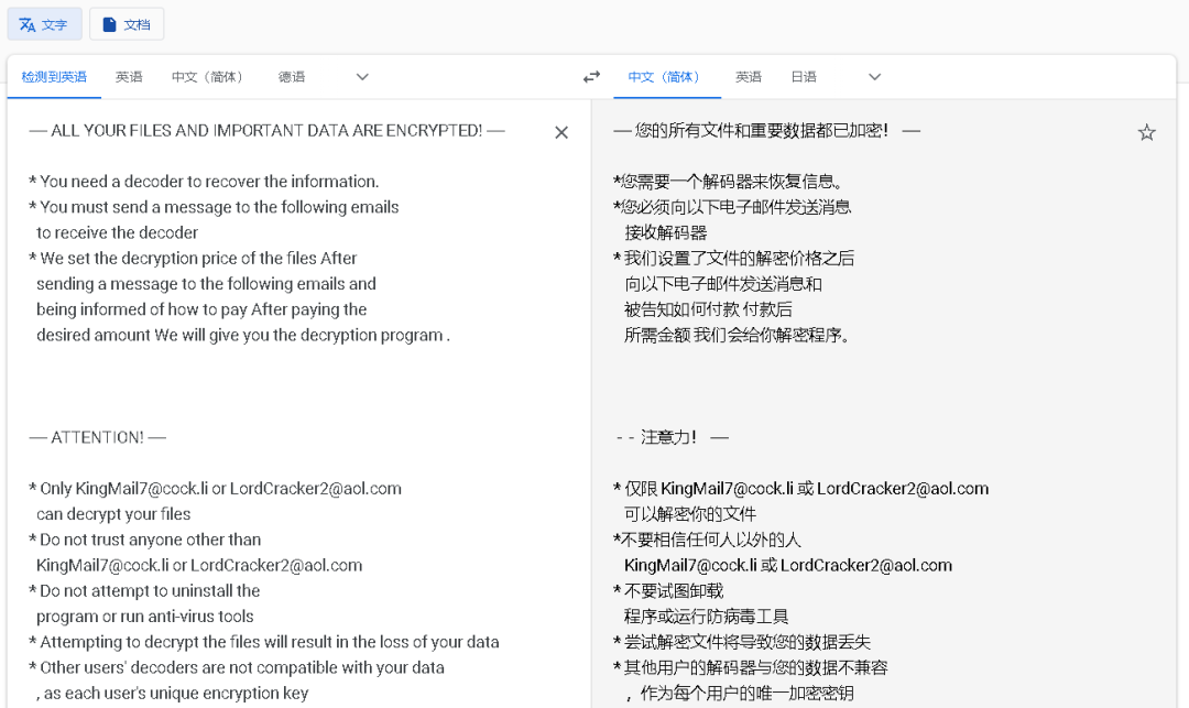 中英文勒索提示(可能来源谷歌翻译),内容完全一致