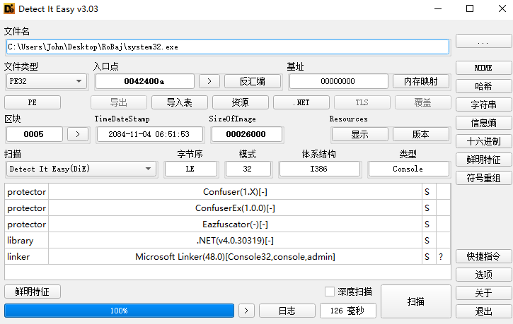 使用 DIE 查看文件的基本信息,发现该文件采用 .NET 编译,并使用了 Confuser(1.X)、ConfuserEx(1.0.0) 的混淆。