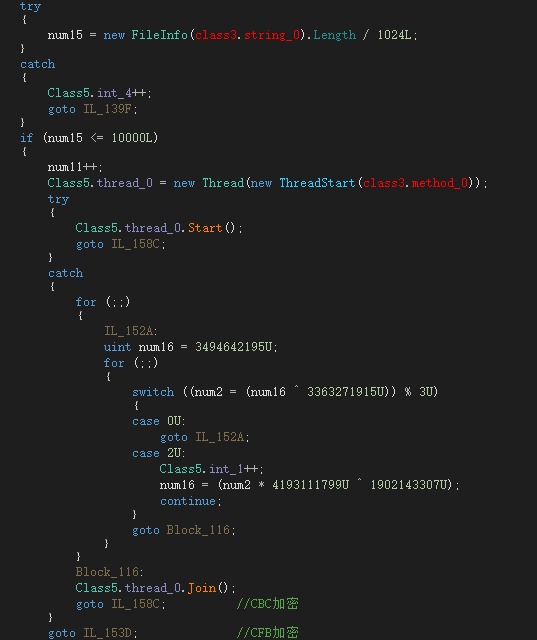 病毒会根据文件大小选择不同模式加密算法:对于小于 10000KB 的文件选用 CBC 堆成加密模式;而大于10000KB 的文件则采用 CFB 对称模式。