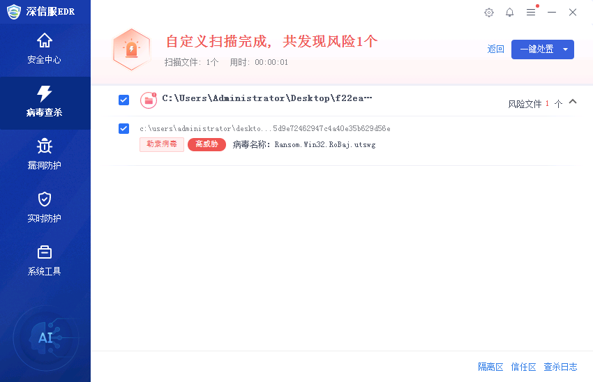【深信服终端安全管理系统EDR】已支持查杀拦截此次事件使用的病毒文件,请更新软件(如有定制请先咨询售后再更新版本)和病毒库至最新版本,设置相应的防护策略,获取全方位的勒索防护;