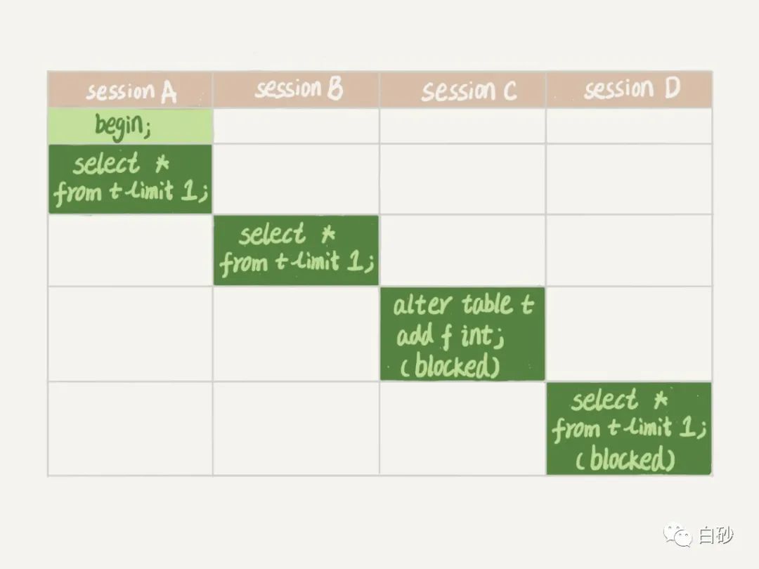 session C 进行表结构修改,此时会对表 t 加上一个 MDL 写锁,这时session A 的 MDL 读锁还未释放,写锁和读锁同时存在,造成互斥,目前只有等待 读锁释放,所以需要等待。
