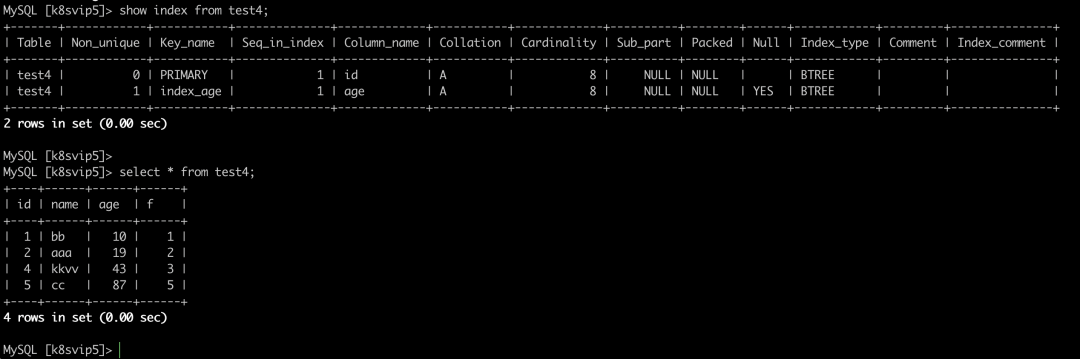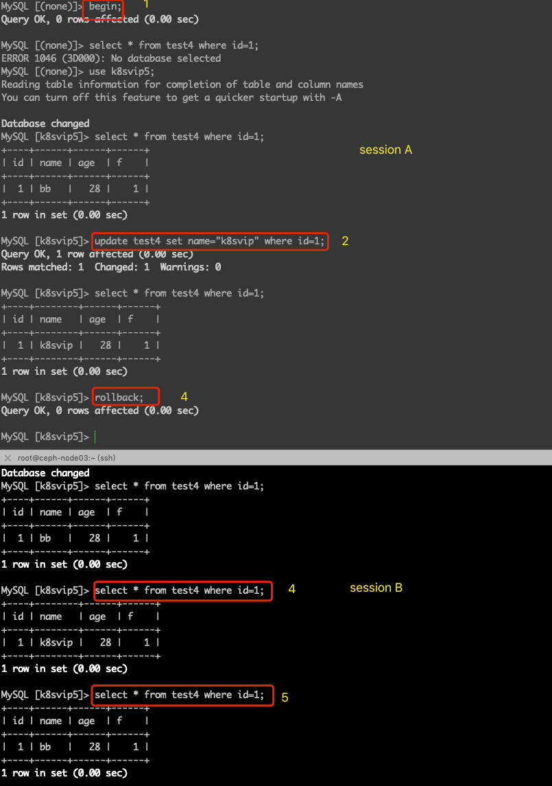| 1 | 1. begin; 2. update test4 set name="k8svip" where id=1; 3. select * from test4; | session A 事务中更新数据,并未提交事务 | |