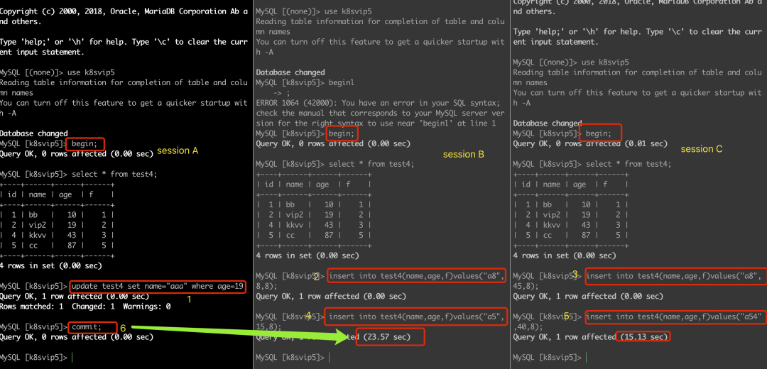 | 3 | 3. insert into test4(5,"cc",28,5); | session B中插入; | |