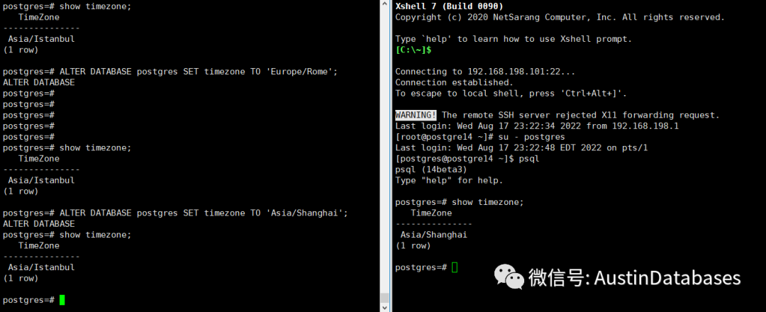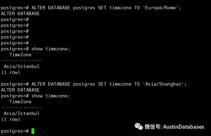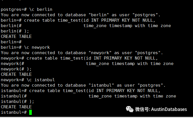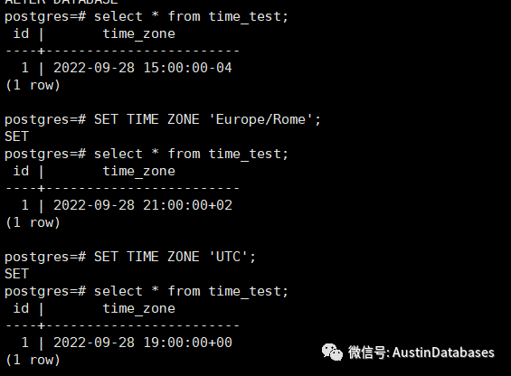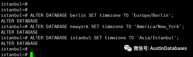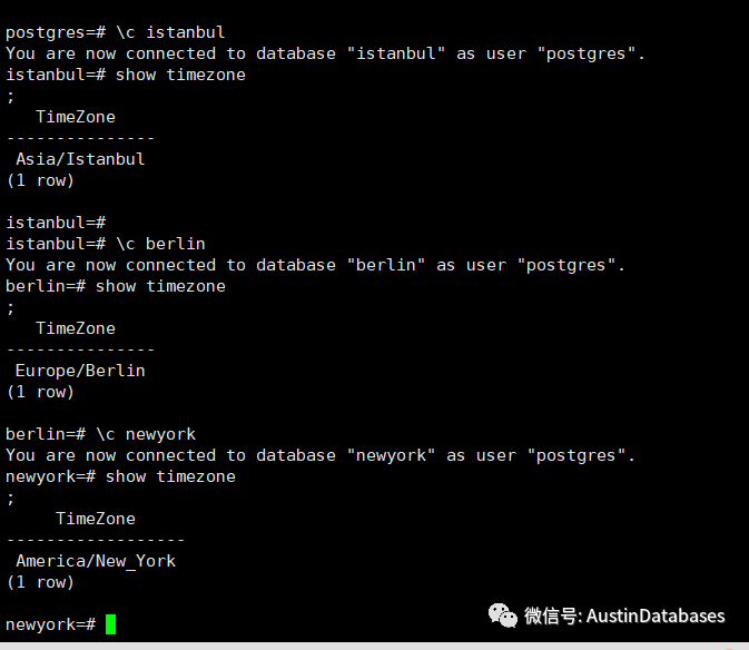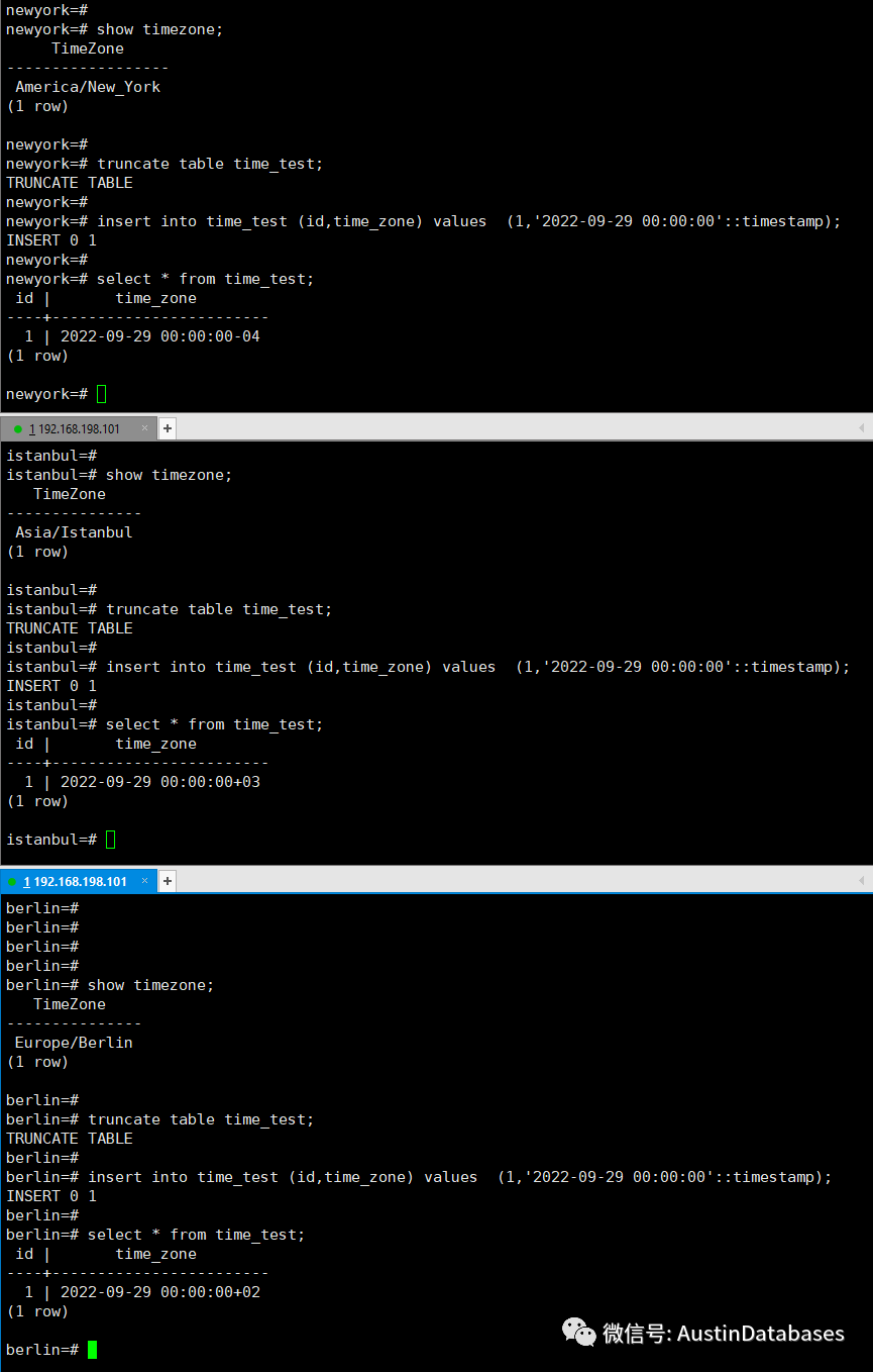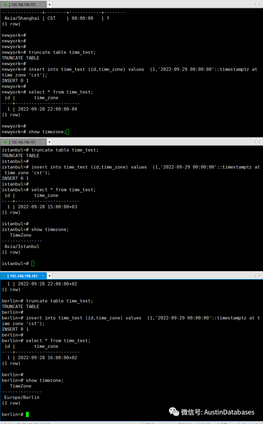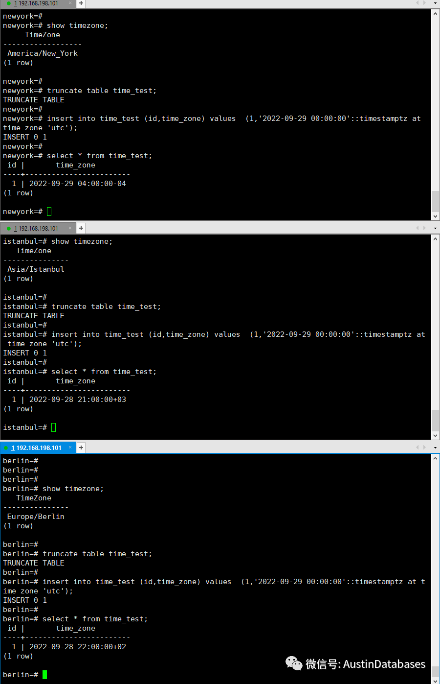 同时我们分别在不同的数据库中,设置他们自己的时区。