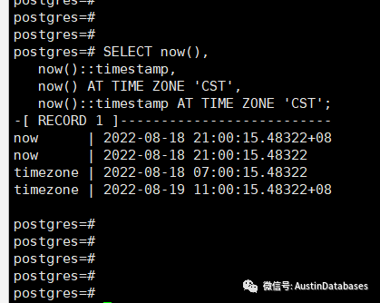 从上面的四个命令中,其中now() 本身是带有时区性质的,这点需要被确认,另外在日期后面也可以改变时间的本身的时区。另外需要注意的是变换日期的问题