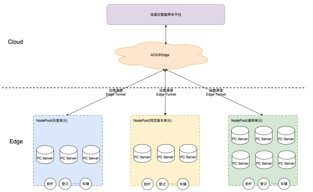 云端管控:只需一条命令,即可快速将节点接入到 ACK@Edge 提供的标准 Kubernetes 集群中,通过云端实现地域分布的计算资源统一管理,通过云端进行统一的应用分发。 单元化发布:根据业务特点,划分不同的节点池,不同车场的算力接入不同的节点池,从而形成不同的发布单元。通过选择不同的发布单元,实现分批发布、灰度发布。 云端运维,远程调试:借助 ACK@Edge 提供的 Tunnel 通道, 可以让开发运维人员快速查看容器日志和进入容器调试。 边缘自治:借助 ACK@Edge 的边缘自治能力,可以在云边网络断开、主机重启这种极端情况下,保证本地边缘服务器上的业务能正常运行。