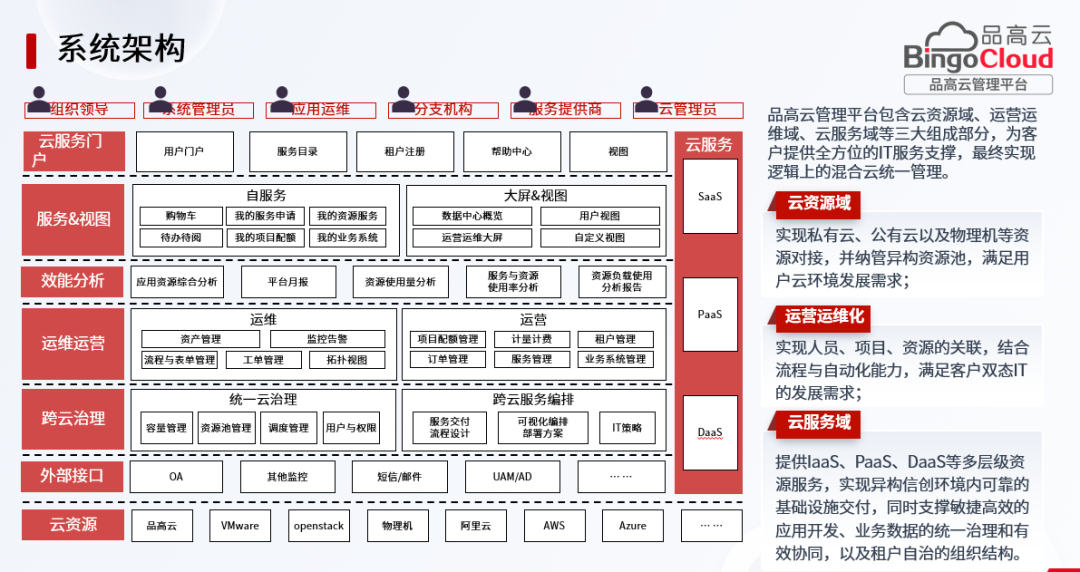 在当前混合多云架构成为企业主流部署模式的背景下,品高股份自主研发的一站式混合云运营运维管理平台产品——品高云管理平台( BingoCMP )作为面向企业 IT 管理部门的多云运营运维管理平台,能够为整个云资源与服务的规划、建设、交付、使用、回收等全生命周期提供运营和运维管理。