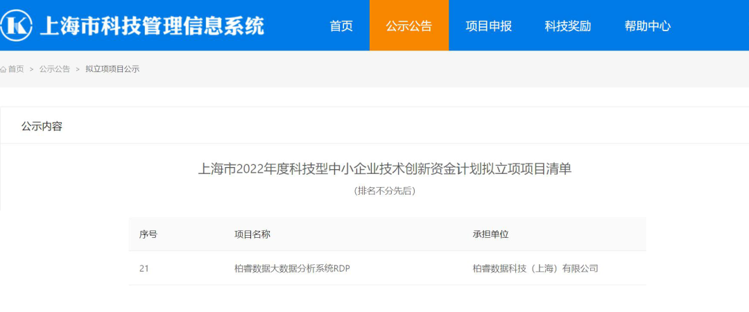 近期,上海市科学技术委员会公示了2022年度科技型中小企业技术创新资金计划拟立项项目清单,“柏睿数据大数据分析系统RDP”成功获批成为该榜单技术创新项目并获得创新资金支持。