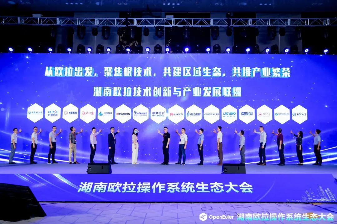 随后,麒麟信安、华为、拓维信息、湘江鲲鹏、超聚变、普元信息、北明信创、优炫软件、东方通、科蓝软件、海量数据、湖南大学、创博龙智、湖南师范大学、湖南财政经济学院、长沙理工大学16家企业和高校共同发起湖南欧拉技术创新与产业发展联盟。联盟将从欧拉出发,聚焦根技术创新,共建区域生态,共推产业繁荣。