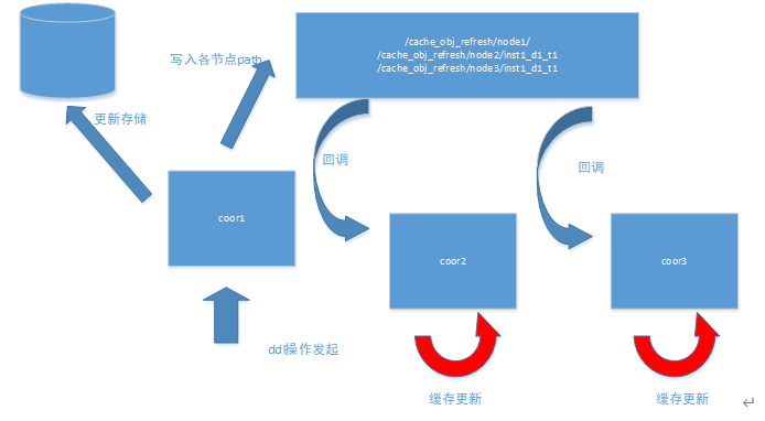 这里可以使用gcware的watch机制,来实现对元数据的缓存对象的及时更新,gcware的watch机制如下:每个节点都可以观察一个路径PATH,如果这个路径有变化则会通过回调函数进行调用通知,具体的处理措施则在回调函数中。