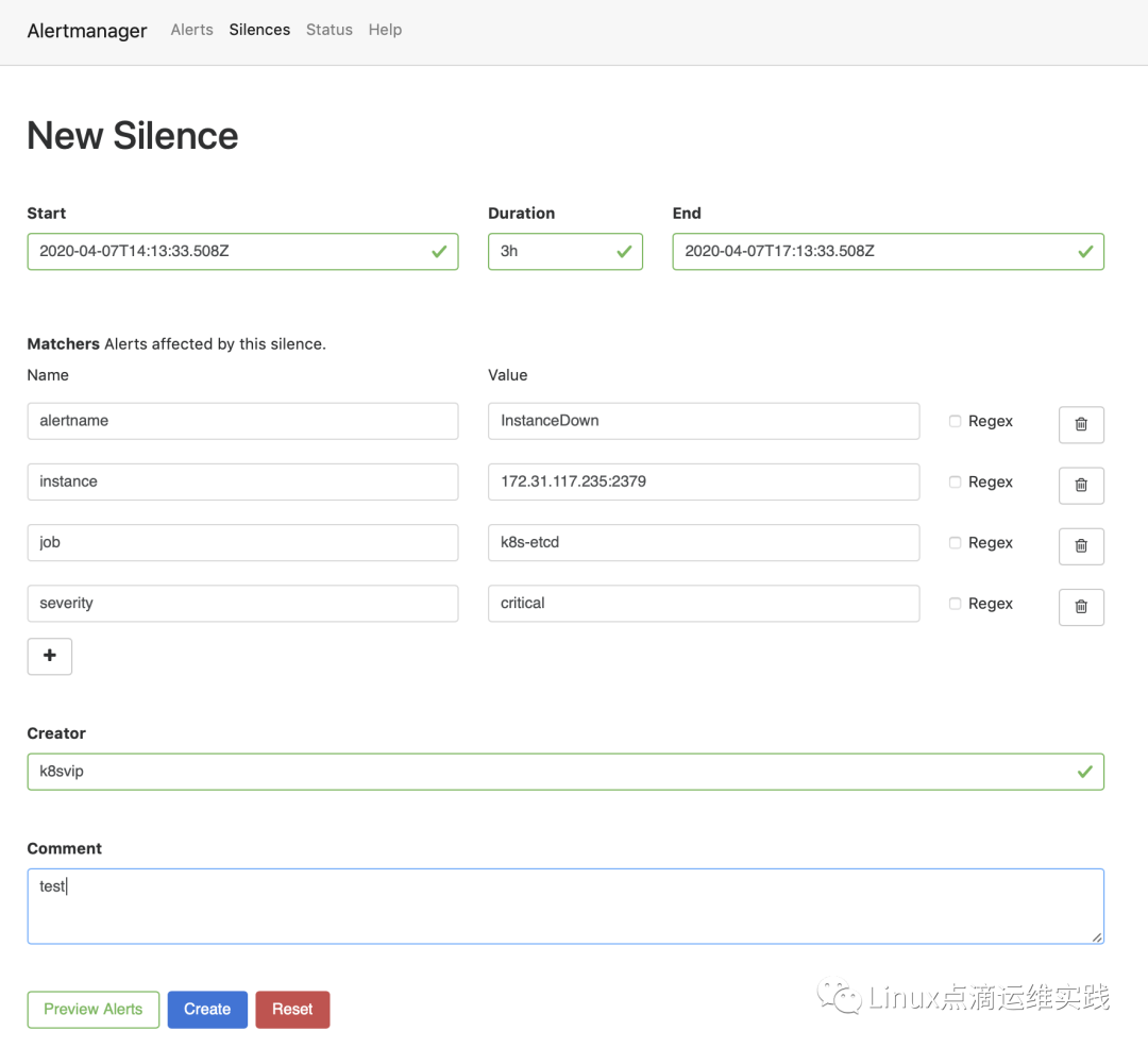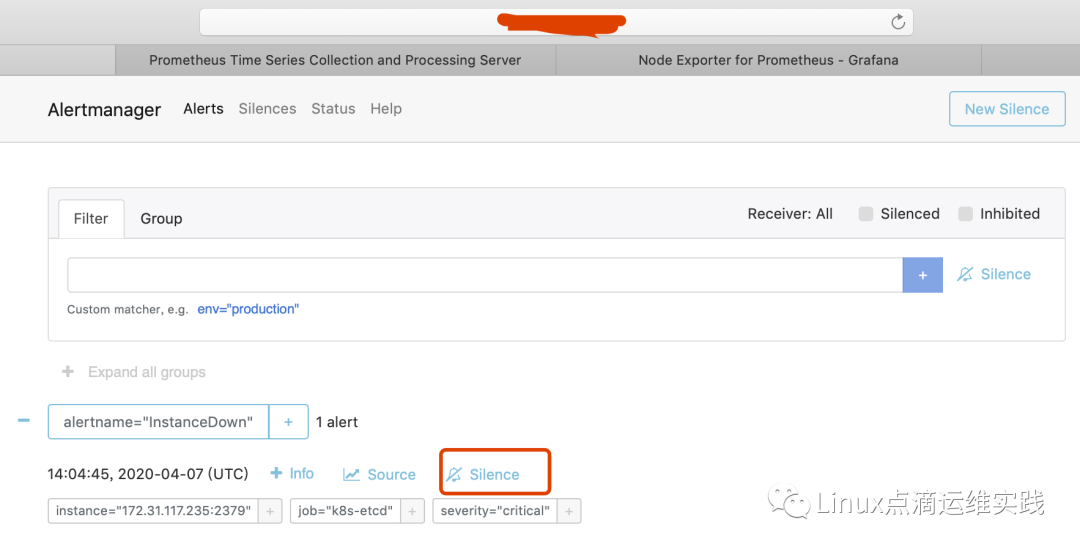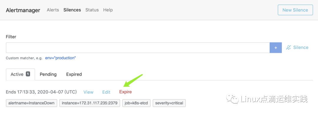 创建完成后,在Alerts中就没有了,会出现在silences标签下面,在这里可以设置取消或者编辑