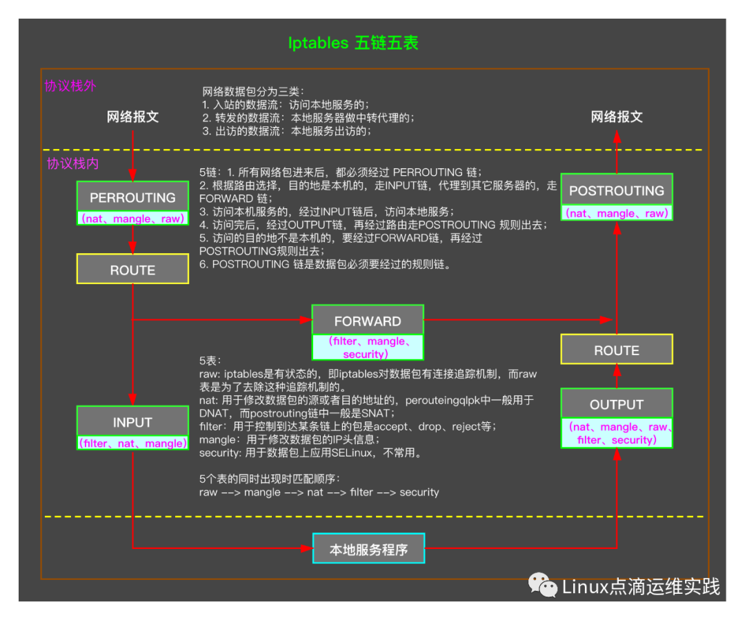 iptables 规则作用在哪里呢?其实就是在 IP 层,IP 层有5个钩子点的位置,其实就对应iptables的 5 条链:INPUT、OUTPUT、PREROUTING、POSTROUTING、FORWARD。