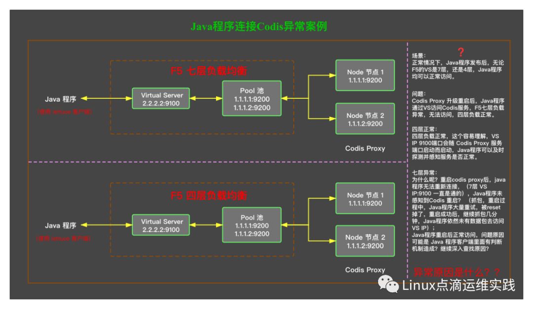 排查过程异常的曲折,当时抓包的时候,在重启完proxy后,立即停止了抓包,就出现类似上面的数据包;继续实验,让Java程序直接连 Codis proxy时,重启Codis proxy,Java程序丢几个包后,很快就能重新获取连接,继续访问codis并操作,RD 认为是F5的问题,F5同学目前也不确认问题原因,从这里可以得出Java 程序通过4层直连codis proxy,codis proxy重启时,Java程序丢几个包后,即可直接继续访问,无需重启;