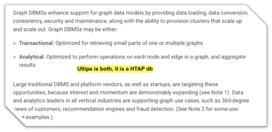 Gartner® 认为,“图数据库正在通过提供数据加载、数据转换一致性、安全性和运维,以及提供向上和向外的扩展集群的能力,以增强对图数据库模型的支持”,并重点将Ultipa的HTAP(处理在线实时分析,Hybrid Transaction Analytical Processing) 架构作为未来数据库发展方向的案例以示说明(见下图)。