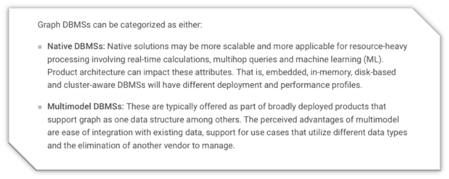 研报中,Gartner®将图数据库类型依据底层存储进行了简单划分:原生图数据库(Native DBMSs)和多模图数据库(Multi-model DBMSs )两大类型。原生图数据库“更适用于涉及实时计算、多跳查询和机器学习(ML)等资源密集型处理场景。”——Gartner®。