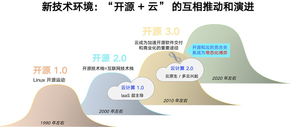 过去 20 年,从互联网创新到数字化,背后有着两个重要趋势:一是“开源”,二是“云”。其中,开源经历了几个不同的发展阶段。第一代开源是 90 年代以 Linux 为代表的的开源运动,主要是对抗闭源软件;第二代开源是 2000 年代,所有移动互联网公司的数字平台都开始采用以开源为主的技术栈。这个时代中,从互联网技术栈中产生了一种重要的 IT 服务形态——云计算;到 2015 年后,随着云计算的 IaaS 层规模越来越庞大以及多云、云原生的兴起,开源也进入了第三代。新一代的开源已经不是互联网公司自己家里的开源,而是每一个场景用户都在用的开源。最重要的软件技术都已经变成原生开源为主的,再结合云计算 2.0 服务形态,形成了“开源+多云”的技术生态。今天,我们正处在开源 3.0 和云计算 2.0 结合的早期阶段。
