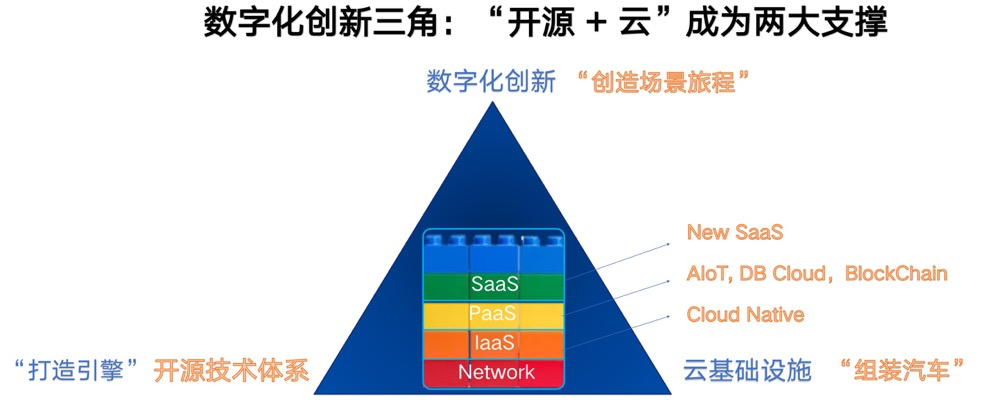 从现在开始到 2030 - 2035 年间,全世界最重要的基础软件技术将多数来自开源项目,如新一代的 SaaS、人工智能、物联网、区块链、低代码、云原生等技术的源头都将是开源,构成了一个个技术引擎。而云计算就像“组装汽车”,可以把好的开源技术引擎组合成云服务交付给用户。开源打造“引擎”,借助云组装成“汽车”,帮助每一个客户更容易走向自己的数字化旅程。这三者形成了一个数字化创新三角,所有技术都会被“开源、云”这两个关键技术重新塑造,这也是未来 10-15 年整个软件行业的主导形态。因为这个大三角的技术环境,今天的数据库和 20 年前的数据库已经有了天壤之别。20 年前,数据库还主要是信息化的交易系统,而今天的数据库既能解决交易系统问题,又要解决大数据分析问题,还要和云厂商结合做云原生的创新,以及通过 AI 更快的发现数据的价值。在这一趋势影响下,有分析机构预测,未来 5 年所有行业的数字化创新速度,会是过去 10 年的 5-10 倍。