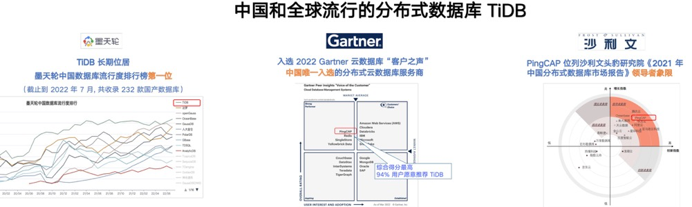 TiDB 是 2015 年创立的全球性开源项目,它处在第三代开源时代起始,一开始就是云原生的状态,在将开源的快速迭代能力和云的敏捷性相结合后,使得 TiDB 这样一个开源数据库只用了 7 年时间,就成为中国最流行的数据库,在墨天轮国产数据库排行榜上一直保持第一名位置。在 Gartner 2022 云数据库“客户之声”中,PingCAP 成为中国唯一入选的分布式云数据库服务商。沙利文头豹研究院也将 TiDB 放在《2021 年中国分布式数据库市场报告》领导者象限。