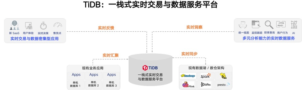 TiDB 的定位便是如此,以一个统一的数据服务层,同时面对海量交易和实时分析,能够满足巨大的吞吐量和各种各样的数据分析要求。作为一个原生的分布式数据库,TiDB 可以从 1 TB 扩展到 1 PB,从单机版数据库覆盖的范围,一直拓展到大数据覆盖的范围。同时,开放的 TiDB 还可以和其他大多数数据湖、数据仓库架构相融合。