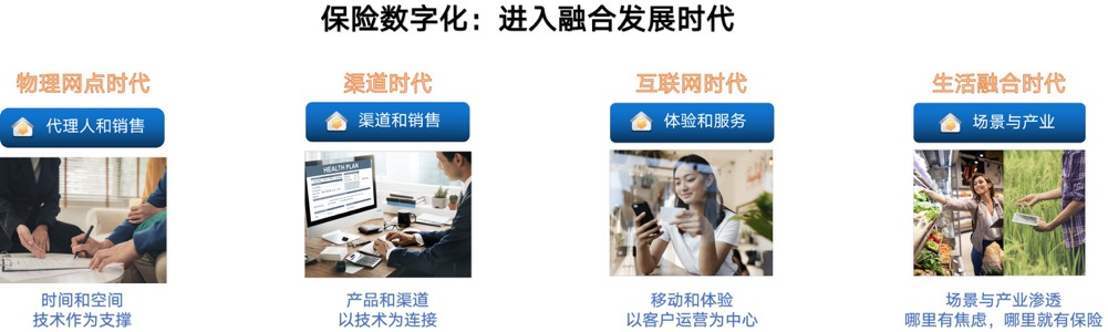 保险行业已经经历了物理网点时代、渠道时代、互联网时代,目前形成了以移动互联网为代表的端侧客户运营和会员体系。再下一代可能是什么?保险将无处不在。未来的场景和产业只要有“焦虑”,就会有保险的机会,都需要将保险融到其中,所以这将是一个“融合时代”。目前,保险行业解决了人的安全需求,如人身焦虑、财产担心、常见的车损等等。未来保险行业肯定也会产生新的形态,这既要尊重人的社会需求,又要考虑新技术带来的更多可能性。