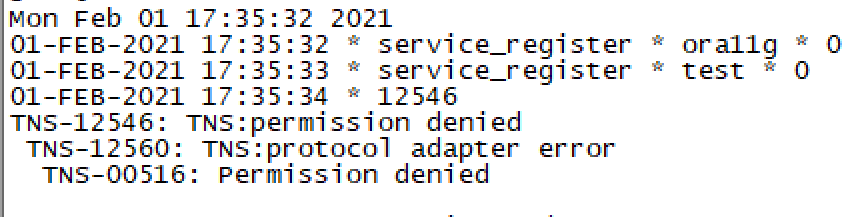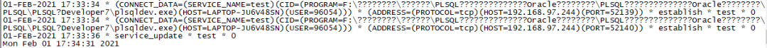 首先正常的外部应用,或者说PLSQL来访问我们的数据库,我们在监听日志里可以观察到如上图所示的日志信息。