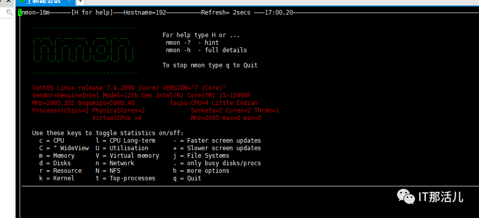 q : 停止并退出 nmon h : 查看帮助 C:图表展示CPU数据 c : 查看 CPU 统计数据 m : 查看内存统计数据 d : 查看硬盘统计数据 k : 查看内核统计数据 n : 查看网络统计数据 N : 查看 NFS 统计数据 j : 查看文件系统统计数据 t : 查看高耗进程 V : 查看虚拟内存统计数据 v : 详细模式