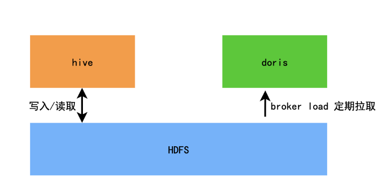客户数据存储在 hive 表中,用 doris 来做实时数据分析工具, doris 本身支持 hive 外表,但性能存在瓶颈,为了提升 doris 分析性能,初期的方案是定期把 hive 表的数据,通过 brokerload 把数据从 hdfs 导入到 doris 中,过程如图:
