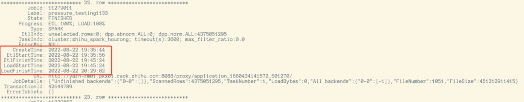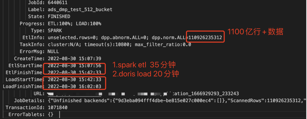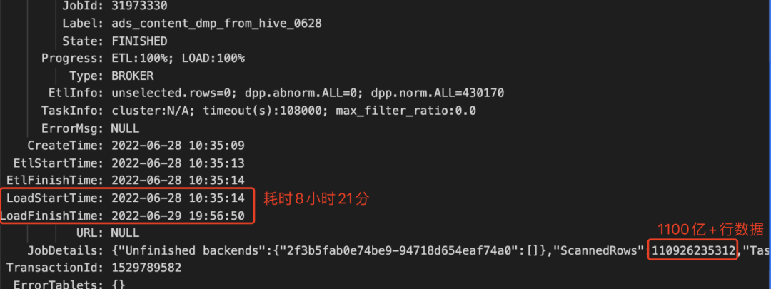 对比之前用 broker load 时导入的耗时,1100亿+行数据导入,耗时8小时+